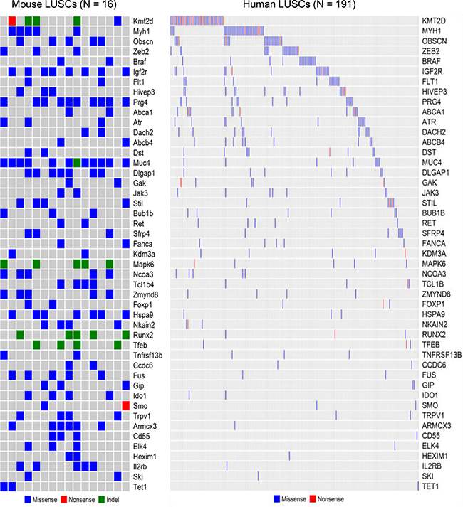 Figure 2: Comparison study of mouse and human LUSC genes. In terms of non-silent somatic mutations, 47 of the 59 cancer genes recurrently mutated in the mouse LUSCs were also mutated in the human LUSCs archived in the COSMIC database. The waterfall plots showed the side-by-side comparison of the 47 mutated LUSC genes shared between mouse and human.