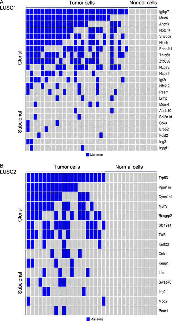 Figure 3: Clonal and subclonal mutations across the tumor cells from the two mouse LUSC tumors. The somatic missense mutations in the cancer related genes of single tumor cells from LUSC1 (A) and LUSC2 (B) were plotted. The corresponding normal cells did not carry any mutations.