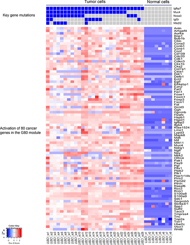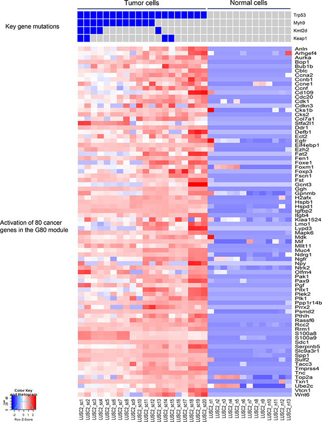 Figure 4: Mutation profiles of the key cancer genes and the corresponding up-regulated cancer genes in LUSC1 single tumor cells. The nonsilent mutations in the key genes correlated with significant upregulation of the expression of 80 cancer genes in the G80 module in the single tumor cells from the mouse LUSC1 tumor.