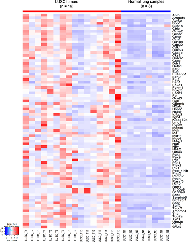 Figure 6: Heatmap of G80 expression in the 16 mouse LUSC tumors versus 8 control normal lung samples. At the bulk inter-tumoral level, the expression patterns of the 80 cancer genes in the G80 module still clearly separated the mouse LUSC tumors from the control normal lung tissues.