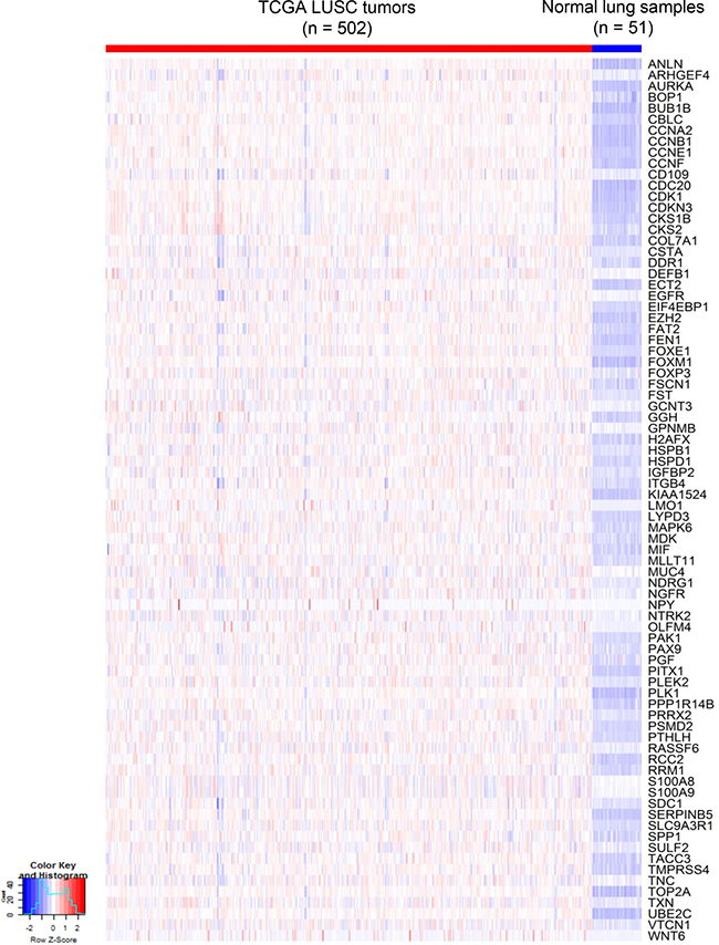 Figure 7: Heatmap of G80 expression in 502 TCGA LUSC tumors versus 51 control normal lung samples. At the bulk inter-tumoral level, the G80 gene expression signature that distinguished between single cells in mouse LUSC model also clearly differentiated the same sub-groups for the TCGA LUSC samples.