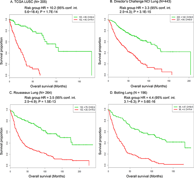 Figure 8: Survival analysis of the G80 module in human LUSC and NSCLC patient cohorts. Kaplan-Meier analysis showing that the expression signature of the G80 cancer gene module was significantly associated with the overall survival outcome in the TCGA LUSC cohort and the other three NSCLC patient cohorts. Red curve denoted high risk group based on the G80 module expression, green curve denoted low risk group based on the G80 module expression.