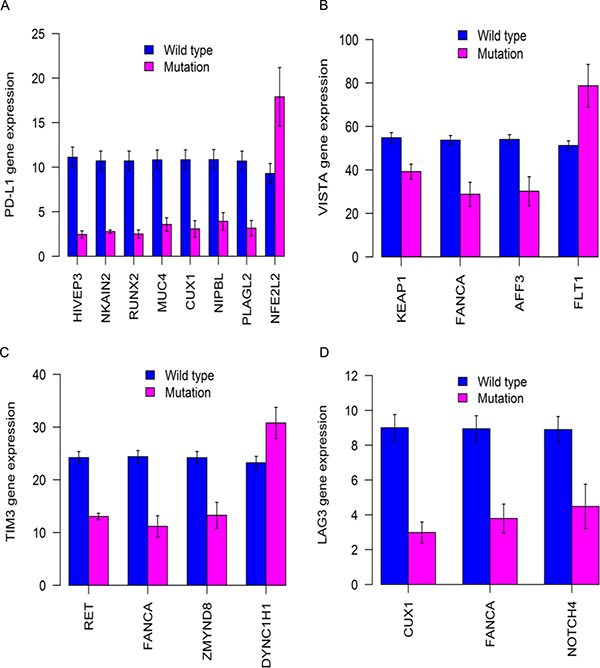Figure 9: Differential expression of immune markers in 176 TCGA LUSCs with significantly mutated cancer genes. Different mutant genes identified from sequencing of mouse LUSC tumors were associated with significantly decreased expression of tumoral PD-L1 (A), VISTA (B), TIM3 (C), and LAG3 (D). All the P values < 0.05 after multiple testing adjustment.