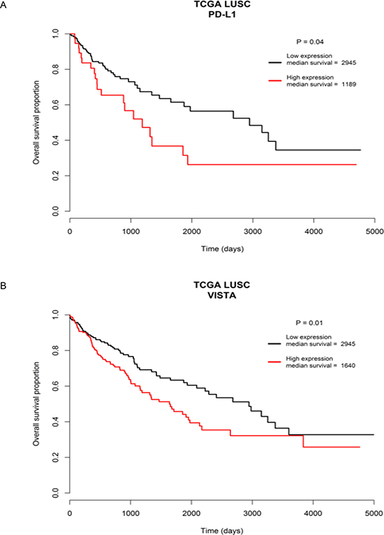 In addition, the LUSC patients with overexpressed PD-L1 or VISTA had significantly worse overall survival outcome compared to the patients with decreased expression of PD-L1 or VISTA (Figure 10). The median overall survival time of high PD-L1 vs. low PD-L1expression group was 1189 days vs. 2945 days (P = 0.04) and of high VISTA vs. low VISTA expression group was 1640 days vs. 2945 days (P = 0.01) (Figure 10). These data suggested that aberrant immune checkpoint gene expression could have significant impact on the survival outcome of LUSC patients.