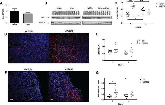 Figure 6: ROCK inhibition increases the recruitment of CAFs and PAI-1 expression in breast cancer xenografts. (A–C) After 18 days of treatment, tumors were harvested and assayed for RhoA activation by G-LISA colorimetric assay (n = 6 per group), and for PAI-1 expression by immunoblotting. (D, F) Primary tumor sections were immunostained for α-SMA and phospho-ERM. (E, G) Y27632 or Y27632+PQ401 increases the number of α-SMA-positive cells in MDA-MB-231 primary tumors while only Y27632 significantly increases phospho-ERM expression. Bar 50 μm Data expressed as mean ± SEM. *p ≤ 0.05, ****p ≤ 0.0001.