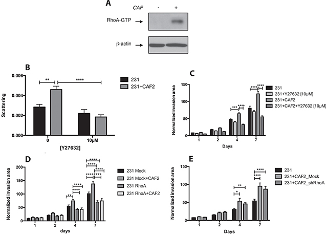 Figure 2: CAFs promote MDA-MB-231 invasion and scattering by activating RhoA/ROCK in cancer cells. (A) Effect of CAFs on RhoA-GTP expression in MDA-MB-231 cells: MDA-MB-231 spheroids were culture with or without CAF2 for 72 h and assayed for RhoA activation by RhoA-GTP pulldown assay. β-actin was used as a loading control. (B–C) Effect of Y27632 [10 μM] on the scattering and invasion of MDA-MB-231 cells cultured with or without CAF2 in a collagen gel. (D) Kinetic of RhoA-silenced MDA-MB-231 cells invasion with or without CAFs in collagen gel. (E) Kinetic of GFP+ MDA-MB-231 cells invasion with RhoA-silenced or mock-transfected CAFs in collagen gel. Data expressed as mean ± SEM. *p ≤ 0.05, **p ≤ 0.01, ***p ≤ 0.001, ****p ≤ 0.0001.