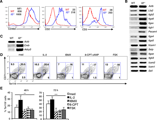 Figure 2: Integrin-cAMP signals influence erythrocyte differentiation. (A) Expression levels of CD49d, CD2 and CD5 on Ter119+ erythroid cells from WT and Il2−/− mice. (B) Level of mRNA expression of various integrins in Il2−/− Ter119+ cells compared to WT mice. (C) Expression of cAMP signaling-related genes Adcy3 and Creb in Il2−/− Ter119+ cells compared to that in WT mice. (D) Distribution of erythroid cells based on CD71 and Ter119 expression in WT BM cells cultured for 48 h either in medium only or in the presence of IL-2, IBMX, 8-CPT-cAMP or Forskolin (FSK). (E) Quantification of Ter119+ cells at 48 and 72 h of WT BM cell culture in the absence or presence of IL-2, IBMX, 8-CPT-cAMP or FSK. Data in (A–C) are representative of three and in (D and E) are representative of two independent experiments. Numbers inside the histograms in (A) represent mean fluorescence intensity (MFI) and numbers inside each FACS plot in (D) represent percent respective populations. Data in (E) are presented as mean ± s.d., **p = 0.0019, ***p = 0.001, one-way ANOVA.