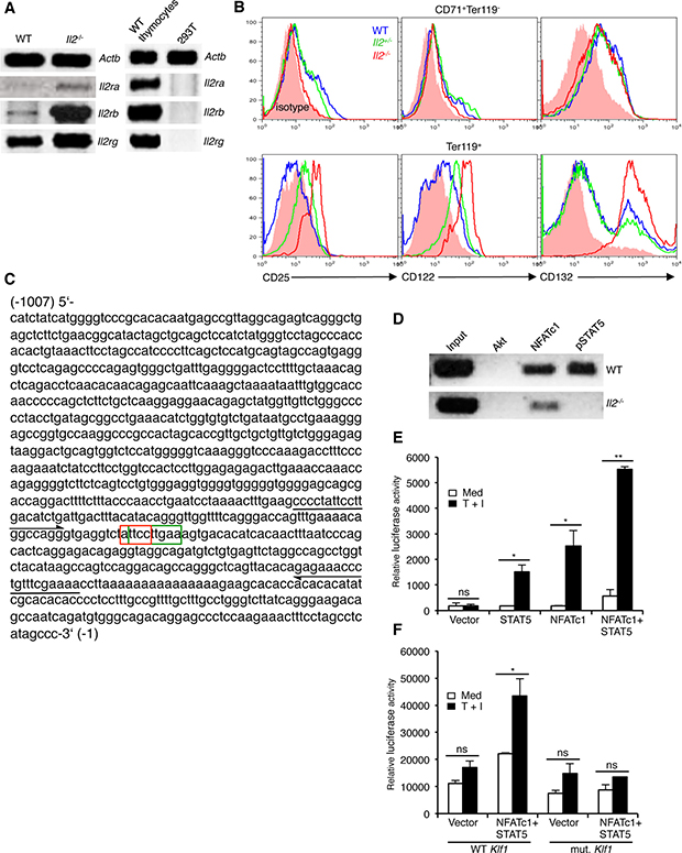 Figure 3: Impaired NFATc1 and STAT5 binding at Klf1 promoter in Il2−/− erythrocytes. (A) Expression of Il2ra, Il2rb and Il2rg genes in Il2−/− Ter119+ cells compared to WT cells. WT thymocytes and 293T cells were used as positive and negative controls respectively. (B) Intracellular expression of CD25 (IL-2Rα), CD122 (IL-2Rβ) and CD132 (IL-2Rγ) in BM CD71+Ter119- and Ter119+ (CD71+Ter119+ + CD71-Ter119+) cells from WT and Il2−/− mice. (C) Nucleotide sequence of 1kb DNA element upstream of the transcriptional start site containing the Klf1 gene promoter. The composite NFATc1 (3′-CCTTA-5′: red boxed) and STAT5 (5′-TTCNNNGAA-3′: green boxed) binding sites are indicated. Arrows in 5′ and 3′ directions indicate the region amplified in ChIP assays for NFATc1 and STAT5 binding to Klf1 promoter. (D) ChIP analysis for NFATc1 and STAT5 binding at the Klf1 promoter region as indicated in (C) in isolated Ter119+ cells from WT and Il2−/− mice. ChIP with Akt Abs was used as a negative control. (E) Luciferase reporter assay depicting the influence of NFATc1 and STAT5 on Klf1 promoter activity in unstimulated or TPA + Ionomycin (T + I) stimulated 293 HEK cells. (F) Effect of NFATc1 and STAT5 on mutant Klf1 promoter (TT-GA) activity in unstimulated or TPA + Ionomycin (T + I) stimulated 293 HEK cells. Data in (A, B, E and F) are representative of three, and in (D) are representative of two independent experiments. Data in (E and F) are presented as mean ± s.d., ns = not significant, and in (E) *p = 0.0178 or 0.0333 and **p = 0.0016, and in (F) *p = 0.0415, paired t-test.