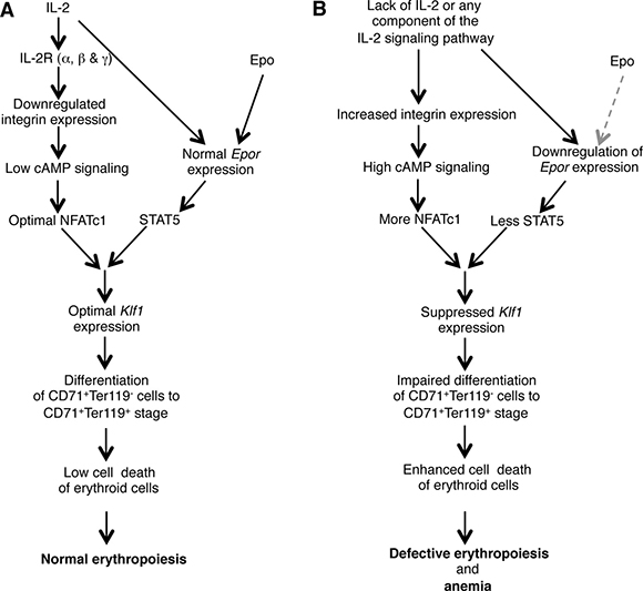 Figure 6: Model showing the role of IL-2 in maintaining BM erythropoiesis. (A) IL-2 signals are essential to lower the integrin-cAMP-NFAT signaling, and in facilitating optimal KLF1 and EpoR expression, which results in normal erythropoiesis in the BM. (B) Deficiency in IL-2 or of any component of IL-2 signaling pathway leads to upregulated integrin-cAMP-NFAT signaling as well as suppressed Klf1 and Epor expression. Both these defects combinedly result in enhanced cell death of immature erythrocytes leading to the development of severe anemia in IL-2 signaling-deficient mice. Grey dashed arrow represents lack of Epo signaling.