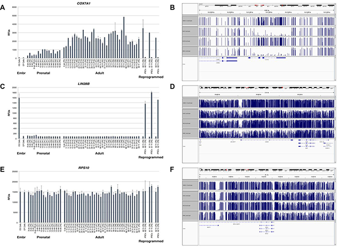 Figure 3: Expression analysis of COX7A1, LIN28B and RPS10 transcripts in human tissues at different stages of development along with methylation analysis of COX7A1, LIN28B and RPS10 genes in human cell lines. (A, C) Dermal fibroblasts of the upper arm from developmental stages spanning the onset of fetal development (eight weeks of gestation) through adulthood were synchronized in quiescence in vitro and RNA subjected to analysis on Illumina gene expression bead arrays. COX7A1 had been upregulated in adult stages while LIN28B displayed the opposite pattern. It should be noted that in iPSCs generated from matching adult tissues the level of expression of these genes demonstrated the reverse pattern compared to adult tissues. (B, D) Four human cell lines were used for methylation analysis by bisulfite sequencing. In two embryonic derived cell lines, 4D20.8 and 30-MV2-6, genomic DNA appears to be methylated at COX7A1 region, while in two adult derived cell lines where COX7A1 expression had been detected its genomic region appears to be relatively unmethylated. LIN28B methylation pattern seems to be unchanged in embryonic and adult derived cell lines. Blue bars represent levels of methylation, one bar for every methylated C. The height of the bar corresponds to the fraction of reads covering that C that are methylated (the highest bars = 1–meaning Cs in all reads are methylated). (E, F) RPS10 was used as a housekeeping control for methylation and expression analysis.