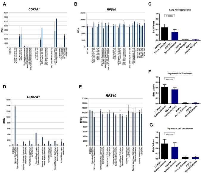 We utilized the following datasets found at GEO database: GSE49996 Lung adenocarcinoma, GSE58272 Squamous cell carcinoma, GSE73003 Hepatocellular carcinoma, and GSE35242 Prostate cancer cells. All datasets were obtained on Illumina HumanMethylation27 BeadChip platform. COX7A1 and RSP10 (housekeeping control) average beta values were calculated using Genome Studio software v2010.3 and plotted using Prizm 6 software.