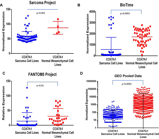 Figure 5: Comparative analysis of COX7A1 expression in sarcoma cell lines vs. normal mesenchymal cell lines. Analysis by t-test demonstrated statistically significant decrease of COX7A1 expression in cancer cell lines comparing to matching controls. Normalized expression or relative expression values of COX7A1 were calculated using transcriptomic data from (A) Sarcoma Project–67 samples, (B) BioTime internal data–103 samples, (C) Fantom5 Project–71 samples, (D) GEO pooled sarcoma and mesenchymal cell lines–over 1000 samples.