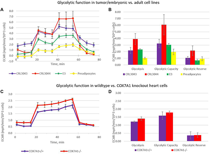 Figure 6: Warburg effect in cells with COX7A1 deletion. (A, B) The figure shows that a glycolytic shift, normally observed in cancer cell lines (CRL3042, CRL3044) and E3 (hESC derived) progenitor cell line, but not adult primary preadipocyte cells, (C, D) Glycolytic shift is also observed in cells, lacking COX7A1 gene: heart cells derived from COX7A1 –/– mouse; heart cells from a COX7A1 +/+ littermate mouse, age 2 months. Just as in cancer and E3 progenitor cells, glycolysis level was higher in cells with COX7A1 deletion.
