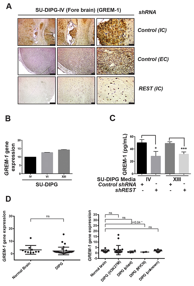 Figure 4: GREM-1 is secreted by DIPG cells in a REST-dependent manner. (A) Tumor-bearing brains of mice implanted with SU-DIPG-IV cells stably expressing either control shRNA or REST-specific shRNA were analyzed by IHC for GREM-1 expression. IC=intracranial tumors; EC=extracranial tumors. Scale bars, 200μm (left panel); 50μm (middle panel) and 20 μm in right panel (B) GREM-1 gene expression in SU-DIPG -IV, -VI and –XIII cells were obtained by Q-RT-PCR measurements. GREM-1 expression was normalized to GAPDH. (C) GREM-1 secretion in conditioned medium from SU-DIPG (-IV and -XIII) cells transduced with either control shRNA or REST-specific shRNA was measured by ELISA. GREM-1 levels were expressed as pg/mL. Data shown as mean+/- SD, *p<0.05; **p<0.01; n=3. (D) Gene expression datasets deposited in GEO were retrieved and analyzed for GREM-1 gene expression using GEO2R as described in Materials and Methods. A comparison between normal brain samples (n=10) and DIPG patient samples (n=35) were shown. Each dot corresponds to one individual patient. Bars represent mean with standard deviations. *p<0.05; ns=non-significant.