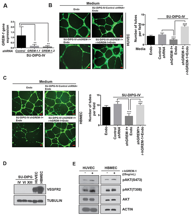 Figure 5: GREM-1 is required for tube formation in vitro. (A) Q-RT-PCR analysis of GREM-1 gene expression in SU-DIPG-IV cells stably expressing either control shRNA or GREM-1-specific shRNA. Lentiviral constructs expressing two different GREM-1 shRNAs (GREM-1.1 and GREM-1.2) were used to knockdown GREM-1. Efficiency of GREM-1 knockdown was determined by Q-RT-PCR and expression was normalized to 18s RNA. Significance is as shown (**p<0.01) (B-C) HUVEC or human brain microvascular endothelial cells (HBMEC) were cultured in endothelial cell medium and or conditioned medium from either control shRNA or shGREM-1.2 transfected SU-DIPG-IV cells. Tube formation in matrigel was measured after 16h and images were obtained. The ability of GREM-1 to rescue loss of tube formation upon REST knockdown was determined by addition of human-recombinant GREM-1 (rGREM-1) to conditioned media-endothelial media mix. Scale bars, 100μm. (C) Quantification of tubes in matrigel shown in Figure B (right panels). Data shown is mean +/- SD, ***p<0.001, n=3. (D) Western blot analysis to assess VEGFR2 levels in SU-DIPG-IV, -VI and –XIII cells, HUVECs and HBMECs was done using anti-VEGFR2 antibodies. Tubulin served as a loading control. (E) Western blot analysis was performed to assess AKT signaling downstream of GREM-1 interaction with its potential receptor VEGFR2 in HUVEC and HBMEC. Anti-pAKT (S473), anti-pAKT (T308), total AKT, and anti-actin were employed.