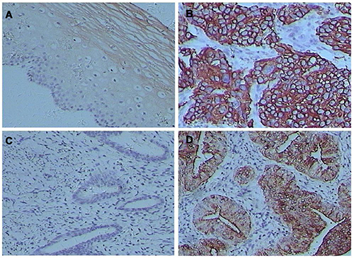 The clinic pathologic parameters were listed in Tables 1, 2 and Supplementary Table 1. Uc.189 was mainly located in the cytoplasm of tumor cells from gynecological cancers and neighboring normal tissue (Figure 1). In CSCC, uc.189 expression was increased in 78.5% of cases (91/116), decreased in 4.3% (5/116), and unchanged in 17.2% (20/116). In EAC its expression was increased in 74.5% (73/98), decreased in 3.1% (3/98), and unchanged in 22.4% (22/98). Expression of uc.189 was increased in 23, and unchanged/decreased in 6, of 29 cases of OCA. Aberrant uc.189 expression was thus detected in most gynecological cancer tissues, and its expression was increased in the majority of cases of CSCC, EAC, and OCA (P < 0.01).