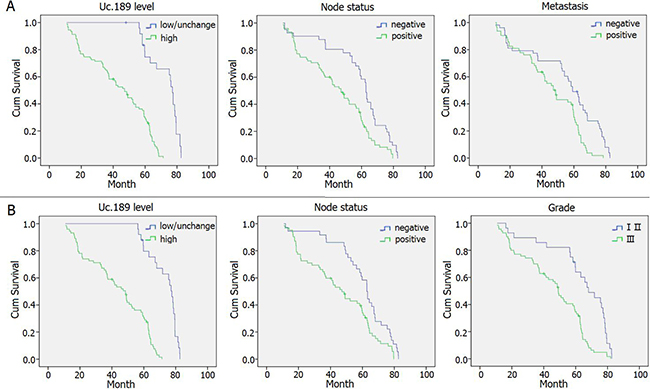 Figure 2: Survival curves in patients with CSCC and EAC according to uc.189 levels. (A) Overall survival curves in patients with CSCC according to uc.189 levels, node status and metastasis (P < 0.05). (B) Overall survival curves in patients with EAC according to uc.189 levels, node status and tumor grade (P < 0.05).