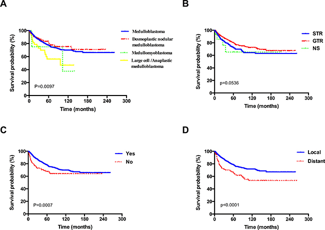 Some major limitations in the current study due to intrinsic limitations in the SEER database made the interpretation of the results difficult. First, no central review of the histologic specimens could be performed. Second, inadequate data, such as total dose, fraction size, radiation ports, and radiation volume were provided in the SEER registry. Third, even though the four core subtypes of MB, including WNT, SHH, Group 3, and Group 4, have been demonstrated to be correlated with patients’ survival and response to treatment [34], information on genetic profiles were unavailable. Forth, information regarding various clinical variables, such as patient performance status and duration of symptoms were unavailable. Last, lack of information on chemotherapy regimens, which might potentially confound our results.