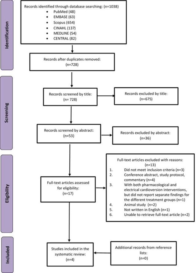 The PRISMA flow chart is presented in Figure 1. The initial search across the databases identified 1,038 records. After removal of duplicates, 728 records were screened, of which 675 were excluded after screening the title and 36 were excluded after screening the abstract because they were ineligible. The full texts were retrieved for the remaining 17 records. Subsequently after screening the full texts, 13 articles were excluded for reasons as shown in Figure 1. In total, four RCT studies were included for this meta-analysis [15, 17, 22, 23].