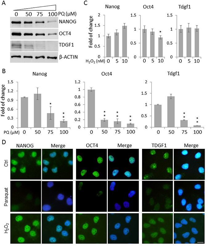 Figure 2: Enhanced ROS decrease the expression of stemness genes in NT2 cells. (A) Cells treated with paraquat (PQ) at the indicated concentrations were lyzed, and the protein levels of stemness markers, NANOG, OCT4 and TDGF1, were examined by Western blot. β-ACTIN was used as the loading control. Cells treated with indicated concentrations of PQ (B) or H2O2 (C) for two days were lyzed for total RNAs. The transcript levels of stemness genes were measured by qPCR. Bar: mean ± SD; *p < 0.05, **p < 0.01 by Student t-test. (D) Cells were treated with 50 μM paraquat or 10 nM H2O2 for six days and immunostained for the above stemness markers. The cells were counterstained with DAPI. Scale bar: 20 μm.