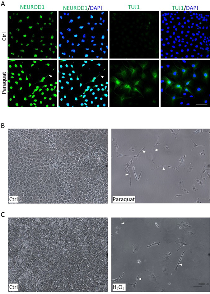 Figure 5: Enhanced ROS cause morphological changes in NT2 cells. (A) Cells were treated with 25 μM paraquat for six days and immunostained with neuronal markers, NEUROD1 and TUJ1. The cells were counterstained with DAPI. The arrowhead denotes neurite-like cellular process. (B, C) Cells were treated with 100 μM paraquat (B) or 5 nM H2O2 (C) for six days, and the morphological changes were visualized by phase-contrast microscopy. The arrowheads point to elongated cellular processes. Scale bar: 100 μm.