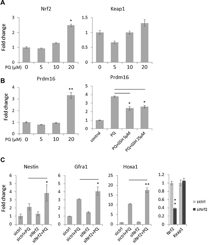 Figure 7: Antioxidant signaling is activated by ROS and is involved in neuronal gene expression in NT2 cells. (A) Cells were treated with the increasing concentrations of paraquat (PQ) for two days. The expression of the key redox signaling genes, Nrf2 and Keap1, was measured by qPCR. (B) Cells were treated with paraquat alone (left panel) or co-treated with paraquat and GSH (right panel). The expression of the antioxidant Prdm16 mRNA level was examined by qPCR. (C) Cells were transfected with siRNA targeting Nrf2 (siNrf2) and then treated with paraquat for two days. The expression of neural progenitor marker (Nestin) and neuronal markers (Grfa1 and Hoxa1) was monitored by qPCR. Bar: mean ± SD; *p < 0.05, **p < 0.01.