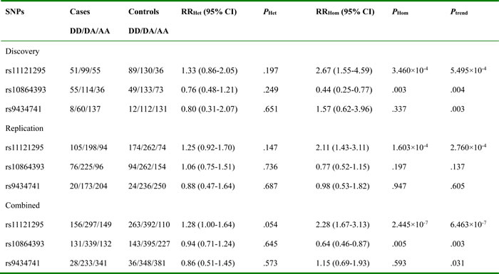 According to the discovery study, SNPs rs11121295, rs10864393 and rs9434741 were selected for the replication and combined studies. Genotype frequencies distribution of rs11121295 was significantly different between the two groups not only in replication study (RRHom = 2.11, PHom = 1.603×10-4 and Ptrend = 2.760×10-4) but combined study (RRHom = 2.28, PHom = 2.445×10-7 and Ptrend = 6.463×10-7; Table 1).