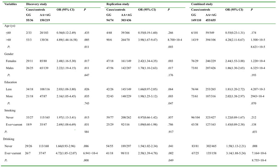 This association of rs11121295 with the Alzheimer’s disease risk was further evaluated by subgroups of age, sex, education, smoking and drinking status with replication and combined studies (Table 2). We found that those carried rs11121295 had a significantly increased risk, and this risk was more obvious not only in the older group (discovery: P = 0.005, and Pi (P2/P1) = 0.011; replication: P = 8.700×10-4, and Pi (P2/P1) = 0.003), but in the drinking group (discovery: P = 6.941×10-4, and Pi (P2/P1) = 0.008; replication: P = 0.002, and Pi (P2/P1) = 0.049) in all two case-control studies, especially their combined study (P = 1.508×10-5, and Pi (P2/P1) = 8.621×10-5 for older group; and P = 7.164×10-6, and Pi (P2/P1) = 8.755×10-4 for drinking group).