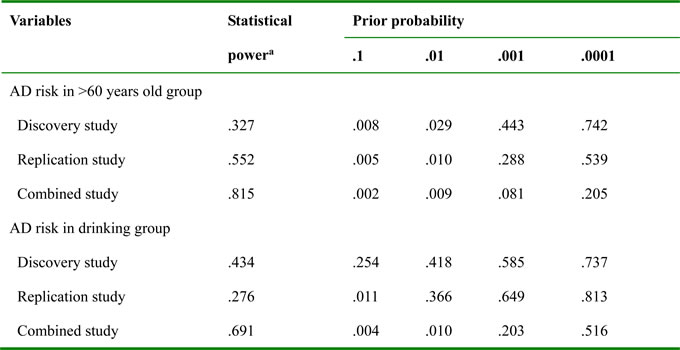 For Alzheimer’s disease risk in older group, the false-positive report probability (FPRP) values of rs11121295 GG were below 0.20 for the assigned prior probability (0.008 for the prior probability of 0.1 in the discovery study; 0.005, 0.010 for the prior probabilities of 0.1, 0.01, respectively in the replication study; and 0.002, 0.009, 0.081 for the prior probabilities of 0.1, 0.01, 0.001 respectively in the combined study). For Alzheimer’s disease risk in drinking group, when the assumption of prior probability was 0.1, significant findings were noteworthy in the replication study but in the combined study (prior probability 0.011 and 0.004, respectively). Moreover, when the assumption of prior probability was 0.01, this prominent association was just found in the combined study (prior probability 0.010; Table 3).