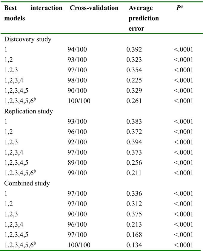 Lastly, gene-environmental interactions were studied. We found that the age was the best one-factor model with the highest cross-validation consistency (CVC) (94/100, 93/100, 97/100) and the lowest prediction error (0.392, 0.383, 0.336) in three statistical analyses respectively (Table 4). The age plus rs11121295 was the best model for two-factors, with the highest CVC (93/100, 96/100, 97/100) and the lowest prediction error (0.323, 0.372, 0.312) in three groups respectively. Interestingly, the model with 6-factors had a maximum CVC (100/100, 99/100, 100/100) and a minimum prediction error (0.261, 0.211, 0.134) in three groups respectively, which presents a model with better prediction than one factor.