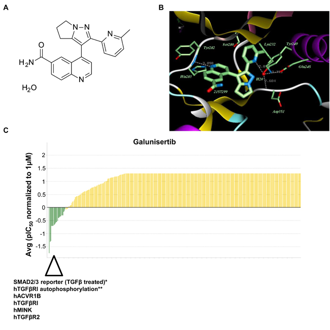 Figure 1: Galunisertib is a selective inhibitor of TGFβRI (Alk5) and Alk4. A. Chemical structure of galunisertib. B. X-ray co-crystal structure of galunisertib bound at the ATP-site of Alk5. Crystallography of galunisertib in the ATP-site of TGFβRI (T204D) is shown with key residues highlighted. C. Galunisertib selectivity profile from DiscoverX analysis of 456 kinases. Galunisertib was tested for binding activity at 3 different doses to generate a concentration response curve (CRC) from which IC50 values were calculated. Examples of the strongest interactions are highlighted below the waterfall plot (hACVR1B (Alk4), hTGFβRI, hMINK, hTGFβR2). In vitro assay data including SMAD2/3 reporter assay (TGFβ treated)* or hTGFβRI autophosphorylation assay** are included in the waterfall plot for comparison.