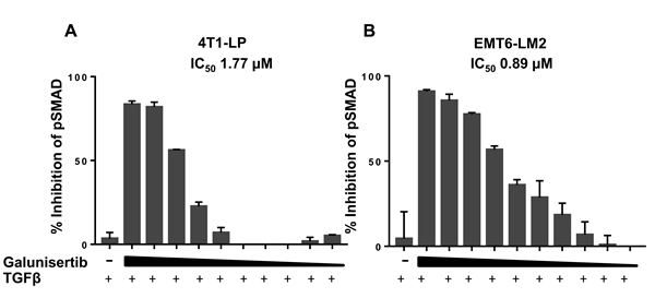 In cell modulatory assays testing NIH3T3 fibroblasts, galunisertib inhibited TGFβ1 induced proliferation with an IC50 of 0.396 µM (Figure 2B, Table 3). This assay represents one of the target tissues in tumors, namely stromal fibroblasts, which are pro-tumorigenic. Direct analysis of the immediate downstream target of TGFβRI confirmed functional activity for galunisertib with an IC50 = 0.064 µM for inhibition of pSMAD in NIH3T3 cells (data not shown); however, galunisertib did not prevent bFGF or PDGF stimulated proliferation of NIH3T3 cells (Table 3), showing specificity of the compound for TGFβ signaling modulation. Finally, galunisertib inhibited TGFβ1-induced pSMAD in the murine triple negative breast tumor cell lines 4T1-LP (Figure 3A) and EMT6-LM2 (Figure 3B) in a dose dependent manner with IC50 of 1.765 µM and 0.8941 µM, respectively. Thus, galunisertib potently and selectively inhibits TGFβ dependent signal transduction events in normal and tumor cell lines with functional in vitro pharmacology effects expected for a selective TGFβRI inhibitor.