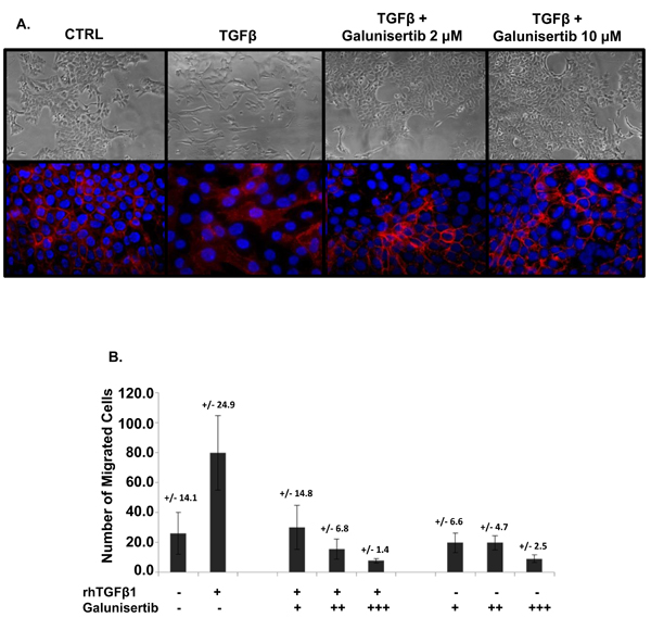 U87MG cells were cultured in minimum essential medium (MEM) supplemented with 10% fetal bovine serum (FBS). Eight micron migration plates (24 well) were coated with denatured collagen I (BD, cat# 354326) at 10 µg/ml. Following overnight incubation at 4°C, the lower chambers were washed three times with phosphate buffered saline (PBS) followed by blocking with 1% bovine serum albumin (BSA) for 1 hour. The chambers were washed 3 times in PBS then 200 µl of migration buffer [MEM containing 5% blocking solution (Sigma, cat# 2393), 100 mM MgCl2, and 100 mM MnCl2] was added. Next, 10,000 cells in 100 µl migration buffer were added to the upper chamber then treated with 100 µl of galunisertib (corresponding to 10 µM, 3 µM, or 1 µM) or control solution. After 1 hour of culture, 10 ng/ml of recombinant human (rh) TGFβ1 was added to upper chambers and cells were allowed to migrate in a 37°C incubator for 48 hours. The non-migrated cells were aspirated and wiped off the upper chamber with a cotton swab. The inserts were washed 3 times with PBS and the chambers transferred to new 48 well plates. The chambers were fixed with 500 µl of 10% neutral buffered formalin (NBF) for 20 minutes followed by three washes with PBS. The cells were stained with Hoechst at 1:10,000 for 20 minutes in the dark then washed three times with PBS. The membranes were cut with a scalpel, placed on a slide and the pictures were taken using Eclipse 90i Microscope. Image Pro-Analyzer 7.0 was used for analysis of migrated cells.