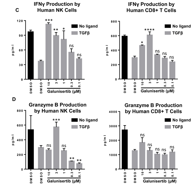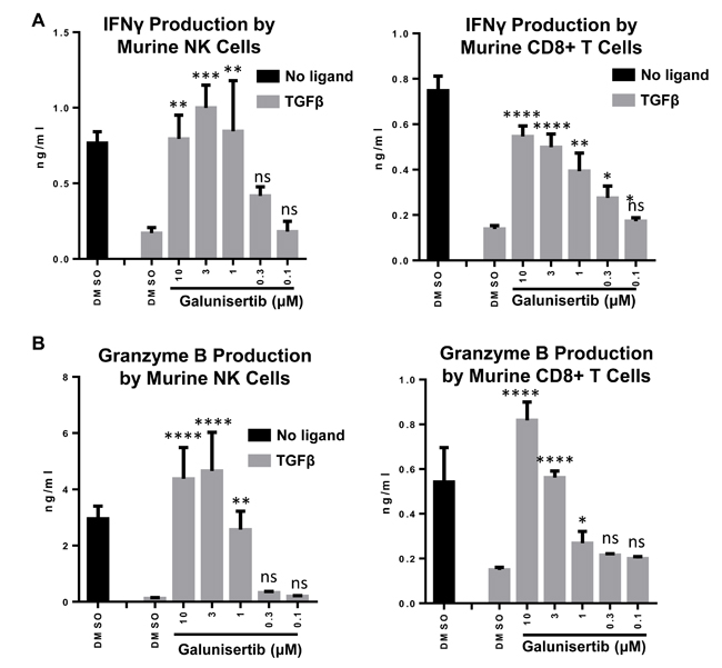 Mouse NK cells and CD8+ T cells were purified from female BALB/C mouse splenocytes by magnetic antibody sorting (Miltenyi Biotec) following the manufacturer’s instructions. After isolation, the cells were re-suspended separately in complete media (RPMI1640, 5% FBS, 10 mM HEPES, 1×NEAA, 1×L-Glu, sodium pyruvate, 1×Penn/Strep, 0.055 mM βME, 50 U/ml IL2) and plated in flat 96-well plates at 37°C for 5-7 days at a density of 5 × 104/well, in triplicate, and stimulated with Treg Suppression Inspector beads (Miltenyi Biotec, Cat# 130-093-627). Cells were cultured with or without TGFβ1 at 10 ng/ml. Galunisertib was added at concentrations ranging from 0.1 µM to 10 μM with DMSO as vehicle control. Cytokine release in supernatants was measured by ELISA (R&D, mouse Granzyme B: DY1865; mouse INFγ:3321-1H-6). One-way ANOVA with Dunnett’s test was used to compare the TGFβ+Gal treatments to the TGFβ+DMSO treatment.