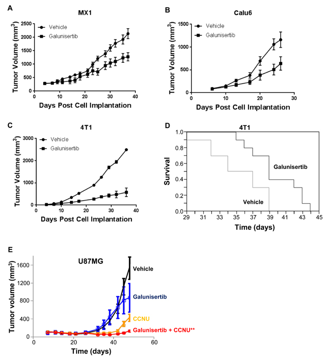 Female BALB/c mice from Taconic Farms weighing 20 to 24 grams were acclimated for 1 week prior to study initiation, had ad libitum access to food and were shaved in the implant area prior to the orthotopic injection of 1 x 105 4T1 cells into the mammary fat pad in a volume of 20 µL media. Ten animals per group were utilized for tumor measurement and survival endpoints. Administration of 75 mg/kg of galunisertib orally twice daily formulated in CMC/SLS/PVP/AF vehicle or vehicle alone were initiated 4 days after injection of the tumor cells and continued until study termination. Tumor volumes were determined by electronic caliper every 2 to 3 days. Statistical analysis was performed by repeated measures analysis and Kaplan-Meier analysis.