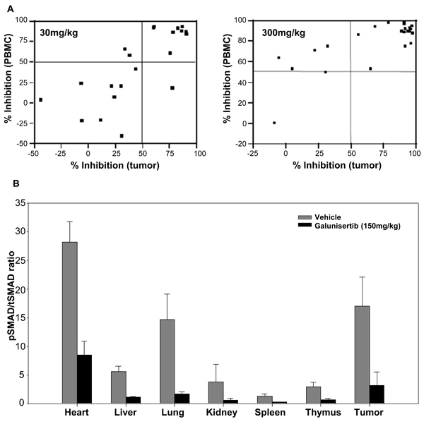 For dose-response assays, galunisertib was administered orally by gavage in either 10% beta-cyclodextrin-HCl or 1% carboxy methyl cellulose (CMC)/0.5% sodium lauryl sulfate (SLS)/ 0.085% povidone vehicle preparation (PVP)/anti-foam (AF) (CMC/SLS/PVP/AF) formulation buffer. Tumors and plasma were collected 2 hours post dosage for analysis of pSMAD and compound levels.