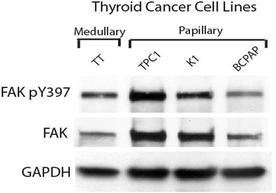 At first, we compared the level of expression of FAK in untreated thyroid cancer cell lines (Figure 1). The medullary cell line, TT, had comparatively low levels of total FAK but a high level of phosphorylated FAK at tyrosine 397 (pY397). In the papillary cell lines, TPC1 had high levels of total FAK, but even higher expression of pY397 FAK. K1, another papillary cell line, had intermediate expression of both FAK and pY397 FAK and BCPAP, also a papillary cell line, had lower levels of total FAK and intermediate expression of Y397, which was the lowest expression of Y397 among all the cell lines (Figure 1). Thus, all thyroid cell lines expressed variable (intermediate and high) levels of Y397-FAK and FAK.