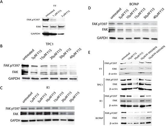 Figure 2: Y15 decreased pY397 FAK and FAK expression in a dose-dependent manner in thyroid cancer cell lines. Western blot demonstrated Y15 decreased expression of phosphorylated and total FAK in four thyroid cancer cell lines in a dose-dependent manner. (A) In medullary cell line TT Y397-FAK expression effectively decreased at 3 μM with Y15 treatment. In papillary cell lines expression of Y397-FAK and FAK is also decreased by Y15: in TPC1 at 30μM (B), in K1 at 50μM (C), and in BCPAP at 40μM (D). (E) PF-04554878 decreased less pY397 FAK and FAK expression than Y15. PF-04554878 decreased Y397 FAK/FAK expression in TT, TPC1, K1, or BCPAP cell lines less than Y15 inhibitor.