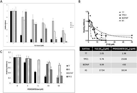 Figure 3: Y15 and PF-04554878 decreased cell viability in a dose-dependent manner in thyroid cancer cell lines. (A) MTS assay demonstrated Y15 inhibited cell viability in a dose-dependent manner in four thyroid cancer cell lines. (B) Upper panel: The inhibitor response curves demonstrated cell line response to Y15. Lower panel: IC50 values calculated using GraphPad Prism from each Y15 dose response curve as described in Materials and Methods. The TT cell line had a greater response than TPC1, which had a greater response than BCPAP, which had a greater response than K1. Right panel: IC50 values calculated for PF-04554878 inhibitor compared to Y15 calculated from Figure 3C. (C) MTS assay demonstrated PF-04554878 inhibited cell viability in four thyroid cancer cell lines. *p<0.05 by Student’s t-test.