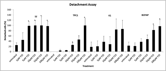 Figure 4: Y15 increased detachment in a dose-dependent manner in thyroid cancer cell lines. Detachment assay demonstrated that Y15 increased detachment in TT, TPC1, K1, and BCPAP thyroid cancer cells in a dose-dependent manner. *p<0.05 by Student’s t-test.