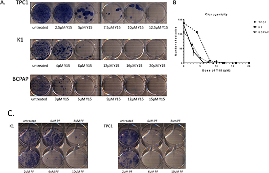 Y15 decreased clonogenicity in papillary thyroid cancer cell lines in a dose-dependent manner.