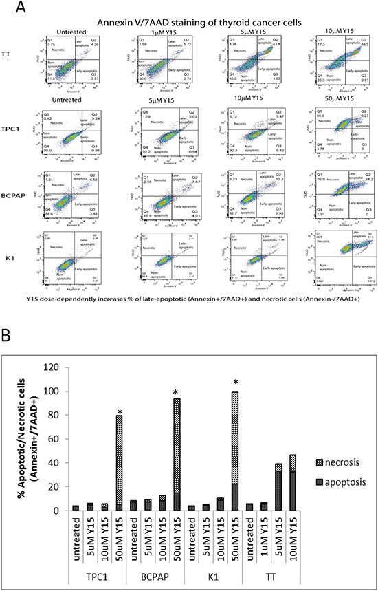 Figure 6: Y15 increased necrosis in a dose-dependent manner in thyroid cancer cell lines. (A) Y15 treated cells demonstrated dose-dependent increase of necrosis detected by staining with Annexin V and Propidium iodide in four thyroid cancer cell lines. (B) Y15 increased necrosis in a dose-dependent manner in thyroid cancer cell lines, with statistical significance found at 50μM doses in TPC1, BCPAP, and K1. *p<0.05 by Student’s t-test.