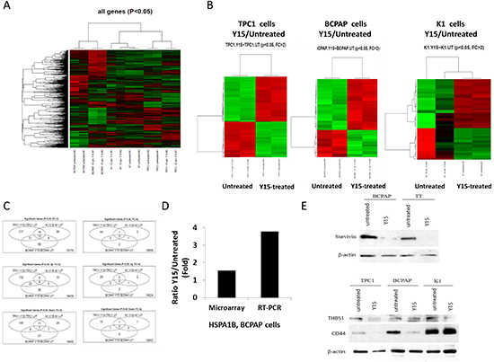 Figure 7: Y15 induced significant gene changes in papillary thyroid cancer cell lines. (A) Heat map of gene changes among Y15-treated and untreated TPC1, BCPAP and K1 cell samples in duplicates. (B) Heat maps comparing Y15 treated to untreated cells in TPC1, K1, and BCPAP cell lines showed statistically significant gene changes over two-fold with Y15 treatment. In each heat map the green represents the gene up-regulation and the red represents the gene down-regulation. (C) Venn diagrams demonstrate the number of common and unique genes significantly changed (up and down-regulated) over two-fold and over four-fold with Y15 treatment in TPC1, K1, and BCPAP cell lines. (D) HSPA1B gene increase with Y15 by microarray and qRT-PCR analysis in BCPAP cells. qRT-PCR confirmed up-regulated gene detected by microarray analysis. (E) Western blotting confirmed gene expression changes with Y15 treatment detected with microarray. Upper panel shows decreased expression of survivin in BCPAP and TT cells with Y15 treatment with beta-actin used as a control. Lower panels show decreased expression of THBS1 in TPC1, BCPAP, and K1 cells. Lower panel shows decreased expression of CD44 in TPC1 and BCPAP cells and constant expression in resistant K1 cells validating microarray data.