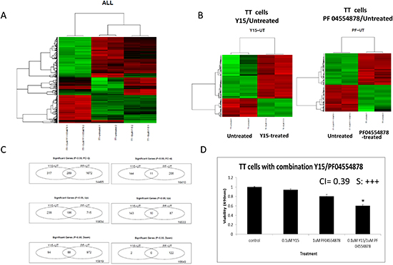 Figure 8: Y15 and PF-04554878 induced significant gene changes in medullary thyroid cancer TT cells. (A) Heat map with all treatment groups demonstrated consistent gene changes between duplicates in treatment groups. The green represents gene up-regulation and the red represents gene down-regulation. (B) Heat maps comparing Y15 treated and PF-04554878 treated to untreated TT cells. (C) Venn diagrams demonstrate the number of common and unique genes significantly changed over two-fold and over four-fold, both up and down, in TT cells by Y15 and PF-04554878 treatment. (D) MTS assay demonstrated synergism with combination 0.1μM Y15 and 1μM PF-04554878 in TT cells. The combination index (CI) for these doses is equal to 0.39. Combination index for each was calculated using CompuSyn. *p<0.05 by Student’s t-test.
