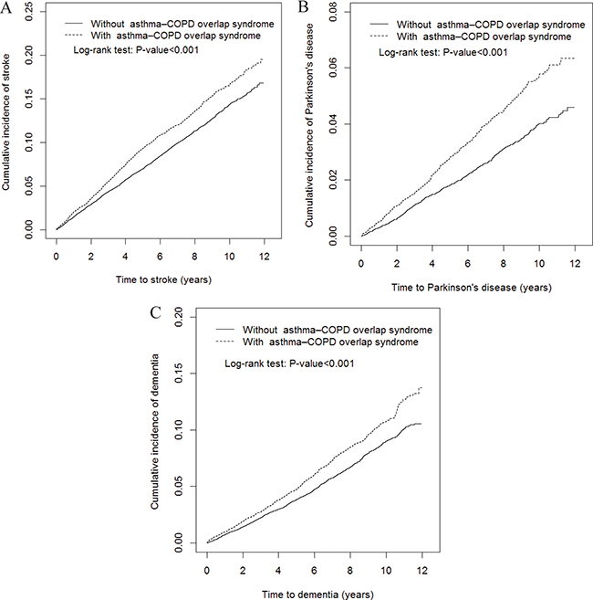 The distribution of characteristics between the ACOS and non-ACOS cohorts showed means and corresponding standard deviations (SDs) for age and determined the number and percentage for sex, age group, comorbidities, and drugs used. The cumulative incidence of stroke, PD, or dementia was assessed using the Kaplan–Meier method, and the curve difference was determined using the log rank test. The incidence density rates of stroke, PD, or dementia stratified by sex, age, comorbidities, and drugs used were calculated in both cohorts. Univariable and multivariable Cox proportional hazards regression models were used to estimate the hazard ratios (HRs) and 95% confidence intervals (CIs) for stroke, PD, or dementia in the ACOS cohort compared with the non-ACOS cohort. Furthermore, the multivariable Cox proportional hazards regression model was used to estimate the risk of stroke, PD, or dementia on the basis of the drugs used for treatment. SAS Version 9.4 (SAS Institute, Cary, NC, USA) was used for data management and statistical analyses. A two-sided P value of < .05 was considered significant.