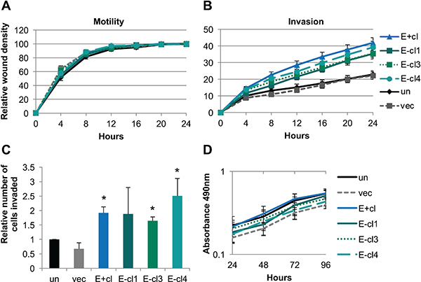 4 × 104 cells/well were seeded in duplicate or quadruplicate in a 96 well Imagelock plate (EssenBioscience). 16–18 hours post seeding, cell monolayers were wounded using the Cell Wounder 96 (EssenBioscience) and washed twice with PBS. For invasion, 50 μL of a 1:10 growth factor reduced Matrigel® (Corning) in supplement free KSFM solution was overlaid followed by an additional 100 μL of supplement free KSFM media once the Matrigel® had set (10 to 20 minutes at 37°C). For motility assays, following monolayer wounding, 100 μL of supplemented KSFM was added. Plates were placed in the IncuCyte Zoom (EssenBioscience) incubator microscope and pictures taken with 10× objective every four hours. Data was analyzed with the IncuCyte Zoom software (EssenBioscience), which calculated the relative wound density defined as the density of cells within the wound as a percent of cell density of the monolayer at the starting time. Statistical analysis was performed by determining the area under the curve for each replicate followed by one-way ANOVA compared against the vector control cell line.