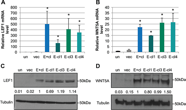 Figure 2: EBV-infected cells maintain increased LEF1 and WNT5A levels after loss of the viral genome. mRNA levels for LEF1 (A) and WNT5A (B) were quantified by RT-qPCR relative to a standard curve. mRNA levels were normalized first to the cellular control hHPRT, and compared to the uninfected parental NOK (un). Shown is the average of three biological replicates analyzed in duplicate and SEM. Representative western blot for LEF1 (C) and WNT5A (D). Tubulin is shown as a loading control. The position of the 50 kDa molecular weight marker is shown. Signal intensity was determined on ImageJ software from at least three independent biological replicates normalized to tubulin. Averaged signal intensity values were set relative to the EBV-positive clone (E+cl). un: uninfected, vec: vector control, E+cl: EBV-positive clone, E-cl1/3/4: EBV-negative transiently infected clones (tiEBV), *p value < 0.05 comparing EBV-infected to uninfected NOK controls.