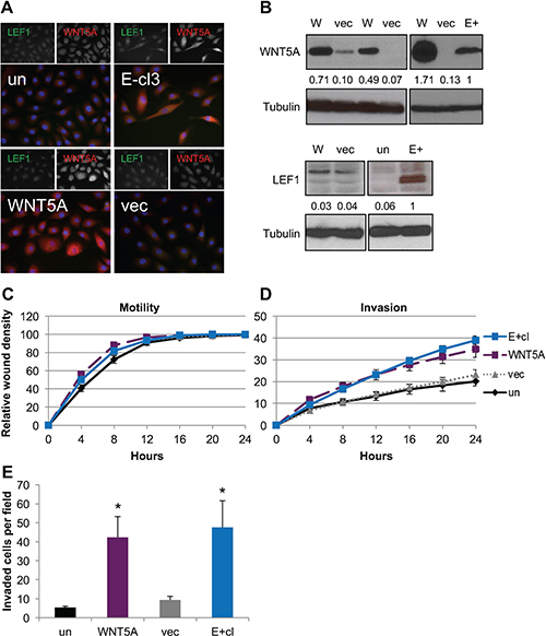 Figure 3: Expression of WNT5A in EBV-negative NOK conferred increased invasion. (A) Representative immunofluorescence for WNT5A (red), LEF1 (green) and DAPI (blue). (B) Representative western blots for WNT5A (top) and LEF1 (bottom) with tubulin shown as a loading control. The average signal intensity of at least three biological replicates normalized to tubulin relative to the EBV-positive (E+) is shown. WNT5A stable cell lines (W), NOK transfected with empty vector (vec), uninfected, parental control NOK (un), EBV-positive NOK (E+) (C) Wound healing motility assay and (D) wound healing invasion assay for WNT5A stable cell lines compared to E+, vec, and un. Shown is the average of six biological replicates run in quadruplicate with error bars representing the SEM. WNT5A and E+ are statistically more invasive that the vector control cell lines (p ≤ 0.04). (E) Chemotactic transwell invasion assay. Shown is the average of six biological replicates analyzed in duplicate with error bars representing the SEM. *p value (p < 0.05) relative to uninfected control (un).