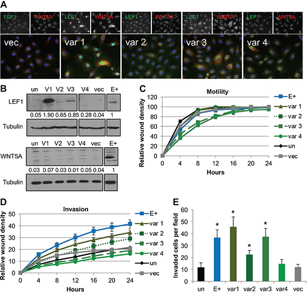 Figure 4: Forced expression of LEF1 variants 1, 2, and 3 enhanced invasion. (A) Representative immunofluorescence for LEF1 and WNT5A. LEF1 is shown in green, WNT5A in red, and DAPI in blue. (B) Representative Western blot for LEF1 (top) and WNT5A (bottom) with tubulin shown as a loading control. Numbers are the average signal intensity of at least three biological replicates normalized to tubulin with E+ set at 1. (C) Wound healing motility assay. Shown is the average of three biological replicates run in quadruplicate with error bars representing the SEM. (D) Wound healing invasion assay. Shown is the average of three biological replicates analyzed in quadruplicate and error bars are the SEM. Using area under the curve analysis, E+ and LEF1 variant 1 were statistically more invasive than vector control cells (p ≤ 0.02). (E) Chemotactic transwell invasion assay. Shown is the average of three biological replicates analyzed in duplicate and error bars are the SEM. *p ≤ 0.008 compared to un. Un: uninfected parental NOK, var1/2/3/4: LEF1 variant 1/2/3/4 transfected NOK, vec: NOK transfected with empty vector, E+: EBV-positive NOK.