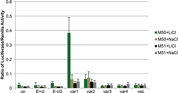 Figure 6: EBV reprogramming of keratinocytes results in alternative response to canonical WNT signaling. Dual luciferase assay for LEF1/β-catenin activity. M50 Super 8× TOPFLASH luciferase plasmid (M50) contains 7 LEF1 response elements and the M51 Super 8× FOPFLASH plasmid (M51) contains 6 mutated LEF1 response elements upstream of luciferase reporter gene. LiCl (lithium chloride) was used to activate β-catenin and NaCl (sodium chloride) was used as a negative control. Values were normalized to renilla as a transfection control. Values are the average of four independent biological replicates and error bars are the SEM. Un: uninfected, E+cl: EBV-positive clone, var1/2/3/4: LEF1 variant 1/2/3/4 overexpressing cells, vec: vector control.